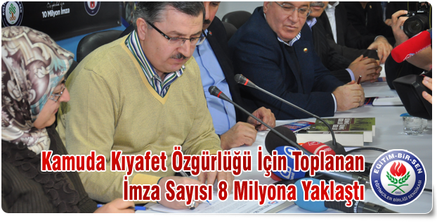 Kamu çalışanlarının saçı, bıyığı, favorisi, tırnak ve ayakkabı topuk boyu ile ilgilenen, giydiği pantolonun kumaşına dahi karışan, kamuda çalışmak için kadınlara başı açık olmayı dayatan, temel insan hak ve özgürlüklerini yok sayan 1982 model darbe dönemi artığı çağdışı yönetmeliğin darbecilerle birlikte tarihin çöp sepetindeki yerini alması için başlattıkları kampanyada, Giresun merkez hariç, bütün illerde kurulan imza stantları ile kamuoyunun desteğini almaya devam ettiklerini kaydeden Ahmet Gündoğdu, “Giresun’da CHP’li Belediye’nin, valiliğin izin vermesine rağmen, şehir merkezinde imza standı kurulması için yaptığımız talebi geri çevirmesi sonrası stantlar açılamamıştır. Teşkilatımızın CHP’li Belediye’yi kınamak için astığı pankart krizi ise sürmektedir. Giresun merkez dışındaki bütün il merkezleri ile bütün ilçelerde açtığımız imza stantlarında 08.02.2013 tarihi itibarıyla 5,5 milyon, işyeri temsilcilerimiz eliyle 1,2 milyon, www.ozgurlukicinonmilyonimza.com sitemiz vasıtasıyla 805 bin olmak üzere toplam 7 milyon 505 bin imza toplanmıştır. 14 Şubat akşamına kadar 10 milyon imza hedefimizi yakalamak için stantlarımız ve internet sitemiz açık kalacaktır” dedi.